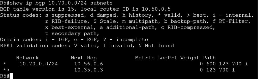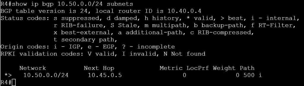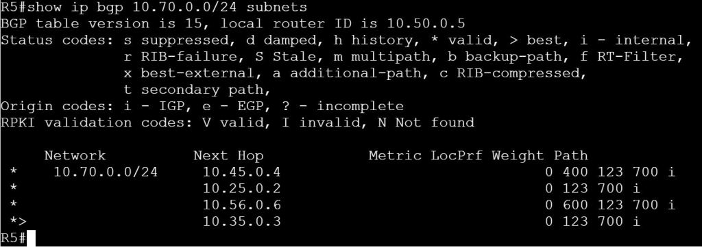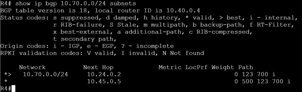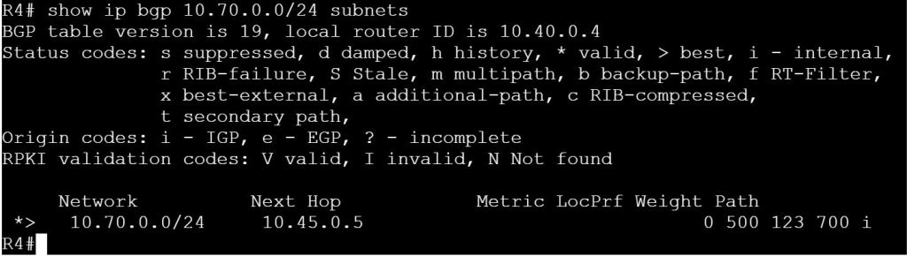 First, let’s verify on R4 that route 10.70.0.0/24 exists.