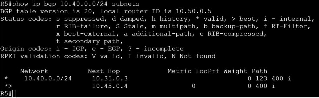 If we control R6, we can add AS-Path Filtering there to prevent AS 400 from being advertised to R5. If not, then we’ll need to also filter routes going out to R6.