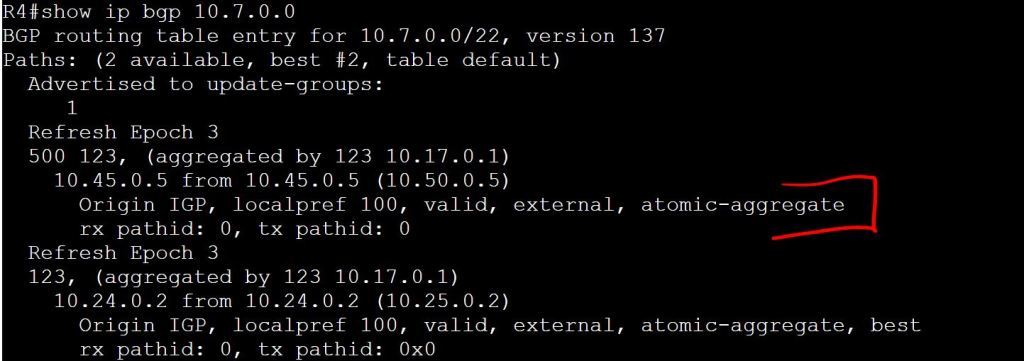 One of the shortcomings with aggregation is that we lose the AS-Path, which we know we need for loop prevention. Let’s take a look at some route aggregation for R7:
