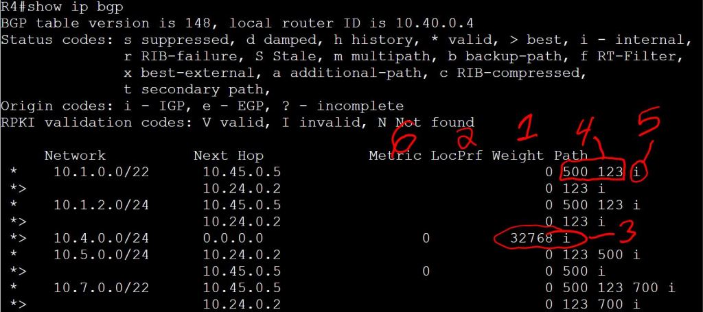So the first four are easy. Just do show ip bgp and they’re listed right there just not in order:
