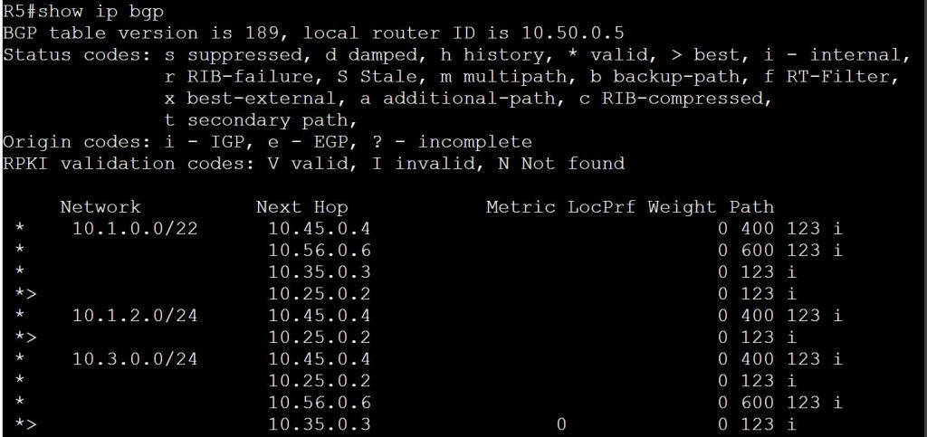 - Origin Code: This is just the i at the end of the line: i beats e beats ?. (I means we used the network command. E isn’t used any more. ? means it’s redistributed into BGP)