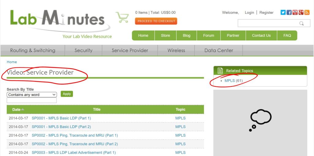 This brings me to MPLS. According to the blueprint, MPLS and DMVPN combined make up just 15% of the exam. (MPLS is a huge topic on the CCIE Service Provider exam, spanning multiple sections.) So the trick for the Enterprise Infrastructure lab will be determining how much time and effort I put into learning the nuts and bolts of MPLS. At the moment, my knowledge is about a 1 out of 5. I understand the how and why at a pretty basic level, but I definitely need to sharpen up. So let’s take a look at labminutes.com and see what kind of MPLS offerings they have: