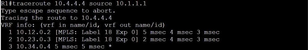The big takeaway is that MPLS traceroute doesn’t work like regular traceroute. The ingress LSR (R1) sends the ICMP message with the TTL of 1 to the first intermediate LSR (R2), similar to regular traceroute, but from there it’s a totally different story. That first intermediate LSR (R2) buffers out the label stack and sends it all the way to the end of the MPLS domain (R4) with a source IP of his own interface that connects to the ingress LSR (R1) and a destination IP of the ingress LSR (R1). It’s pretty wonky.