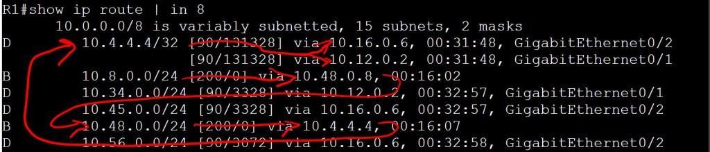 To get to 10.4.4.4, take 10.16.0.6 or 10.12.0.2, which R1 learned from EIGRP.