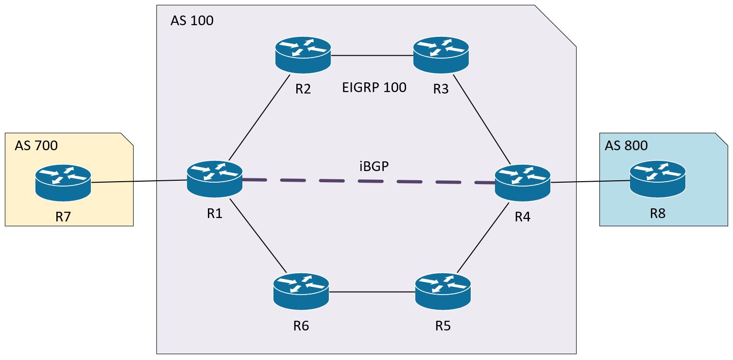 The idea is that AS 100 is a transit AS between AS 700 and AS 800. There’s no direct link between R1 and R4, there’s just the logical iBGP neighborship. So we have a little bit of a problem here.
