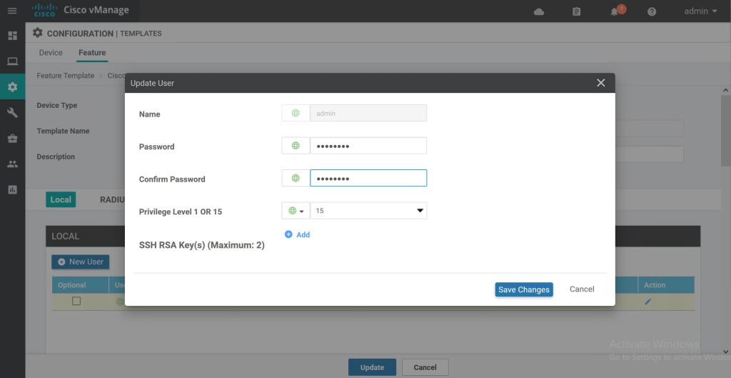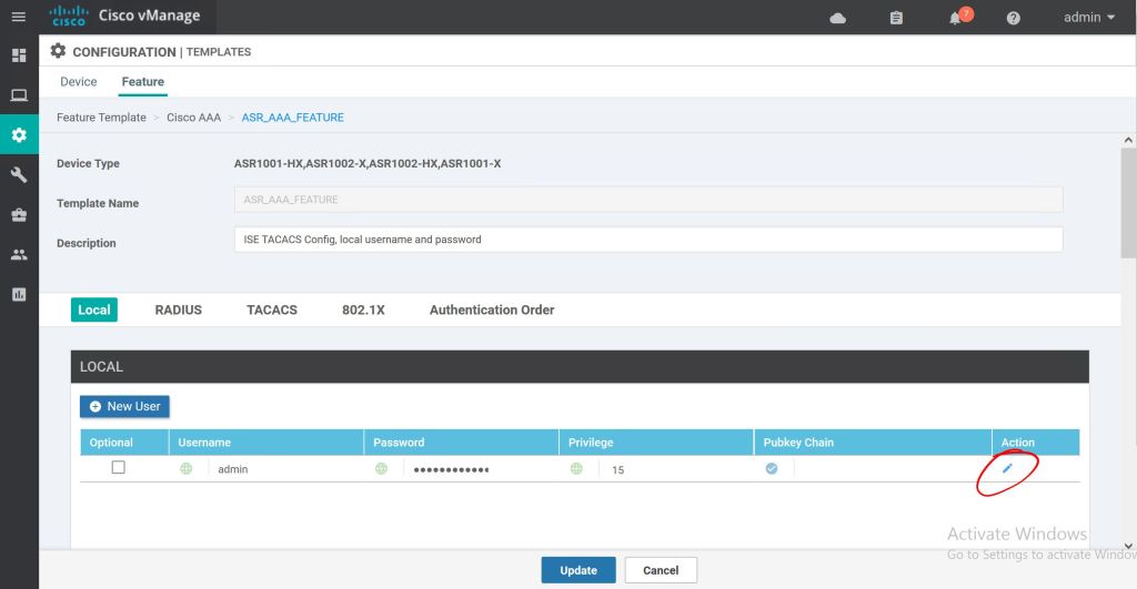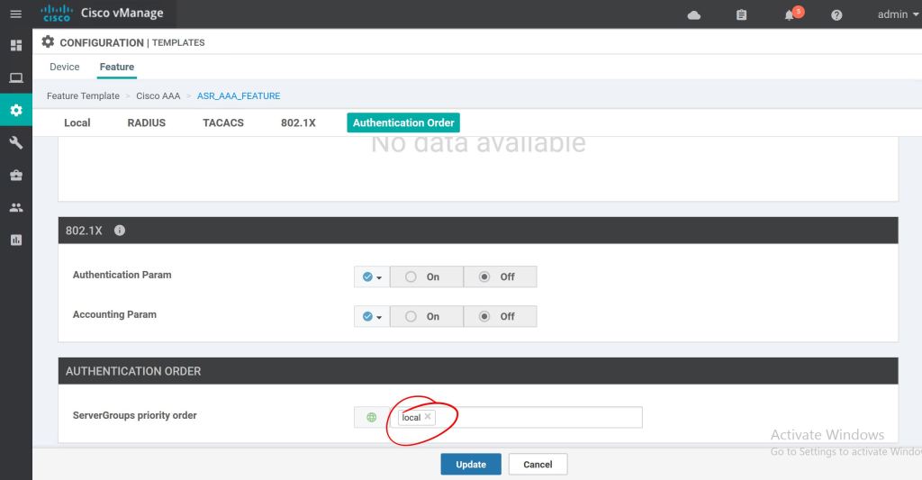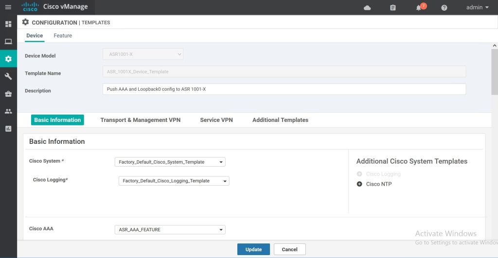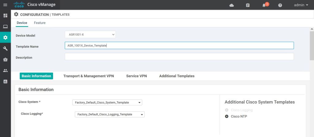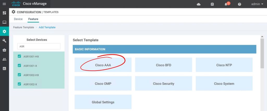 Most of the template settings we can just leave at Factory Default. For Cisco AAA, we’ll select the drop down and pick our custom Feature Template, ASR_AAA_FEATURE.