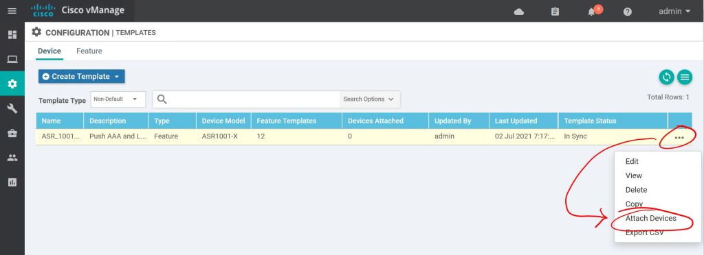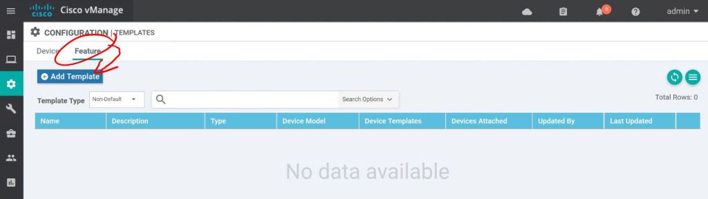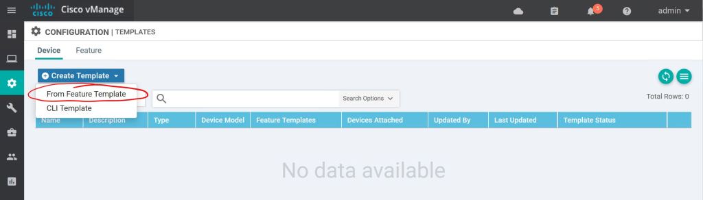 Let’s go to Configuration > Templates > Device to create a Device Template. Click Create Template and choose From Feature Template.