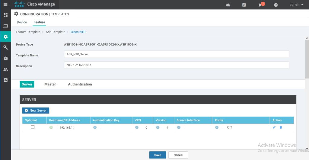 We’ll repeat those same steps for adding an NTP server. Just click to add a new feature template, select the router types, then select the Cisco NTP feature.