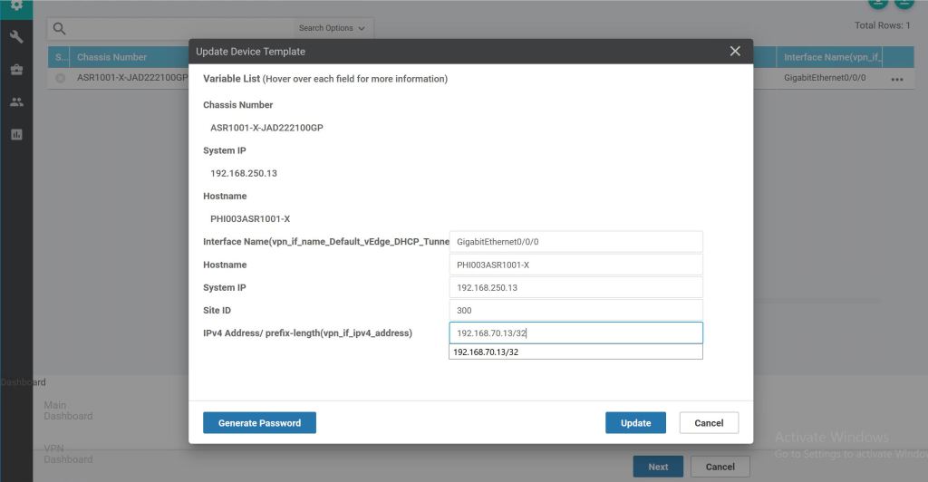 Then it’s as easy as filling in the blanks and clicking Update… sort of. Notice the first four fields are not ones that we created a feature template for. But they’re required, so we have to fill them in. The last field is the Loopback0 variable we had created as part of the feature template process.