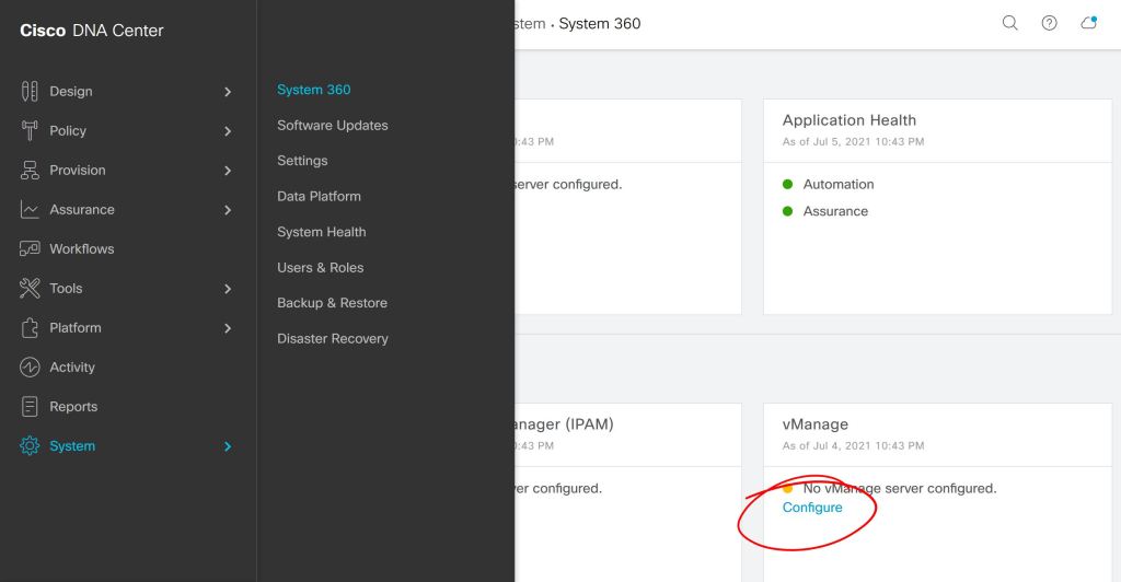 First thing, you kick off the connection from DNAC, either under System > Settings or System > System 360.