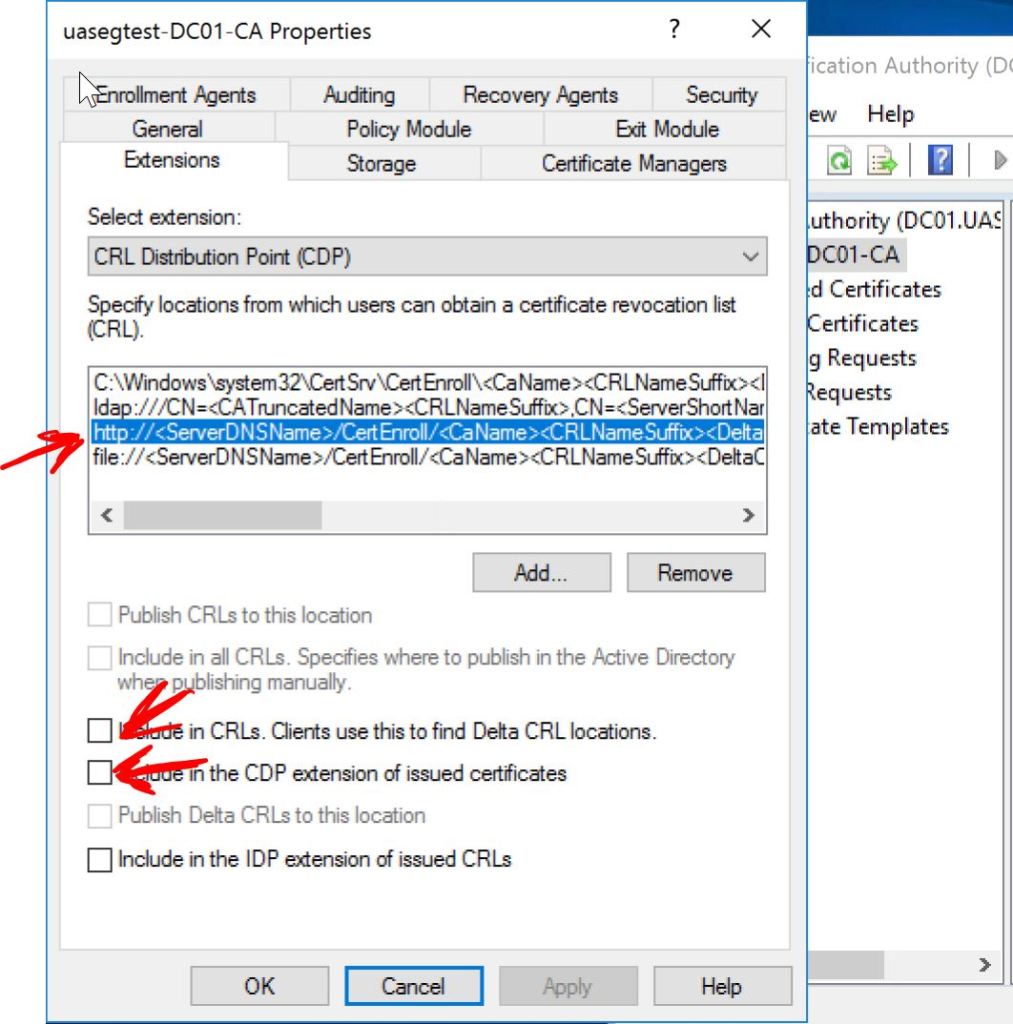 Then we’ll click on the http: entry and check the following two boxes, Include in CRLs and Include in the CDP extension of issued certificates.