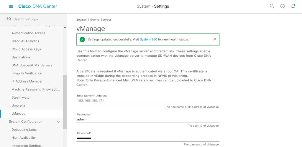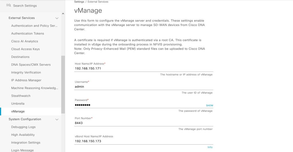 I am currently working on integrating SDA with SD-WAN and have encountered an issue. In my Eve-NG setup, SD-WAN is configured and connected to the dCloud SDA lab through a Fusion router using DMVPN. I have correctly advertised routes via BGP, and vManage can successfully ping DNAC. However, when attempting to add vManage to DNAC, I receive the Internal server error. And when I further look into Audit log, I see error mentioned as “Unable to add empty vManage credentials.”