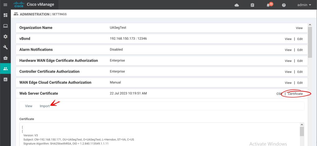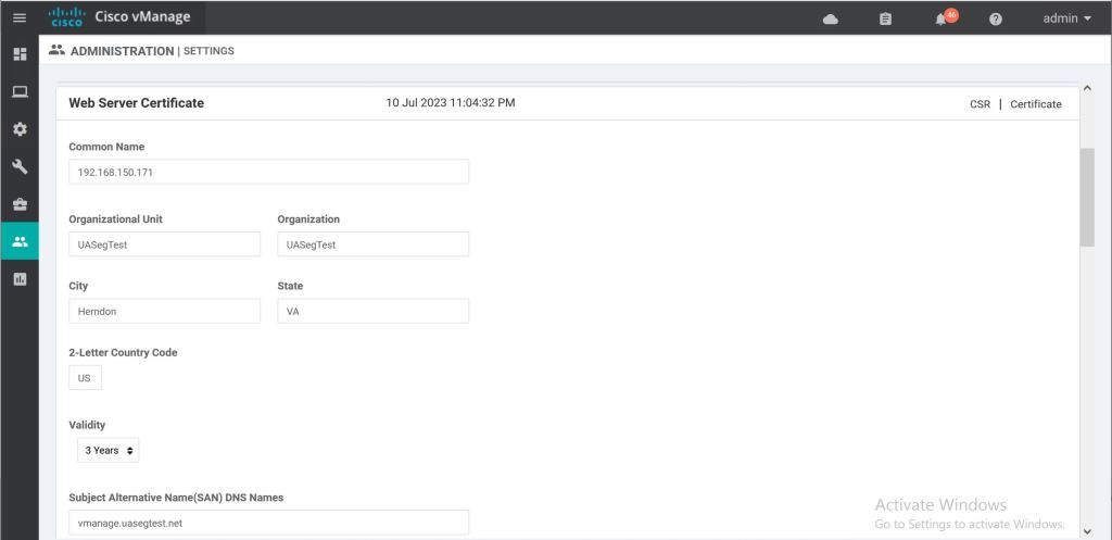 Now we need to go back to vManage and re-do the Web Server Certificate under Administration > Settings > Web Server Certificate > CSR.