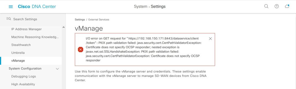 I have created a user with netadmin privileges in vManage and have also added both the ROOT certificate and the vManage web server certificate to DNAC’s trusted certificate list. Despite these configurations, the problem persists.