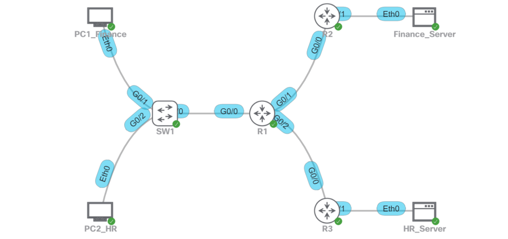 The idea for this setup is that we don’t want Finance users talking to the HR server, and we don’t want HR users talking to the Finance server. A good way to do this in a real life scenario would be with CTS tags, which would be assigned to the users when the log ont the network with 802.1x, and then enforced at the destination point where the IPs of those servers have a static IP to SGT mapping (micro-segmentation). But since we’re labbing VRFs, we’re going to do this with macro-segmentation (VLAN + VRF).