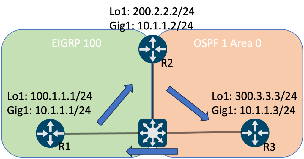 This one is weird enough to show up on the lab exam. On the following diagram, all three routers’ Gig1 interfaces are in the same subnet, 10.1.1.0/24. R1 and R2 are EIGRP neighbors. R2 and R3 are OSPF neighbors. R2 is redistributing OSPF into EIGRP.