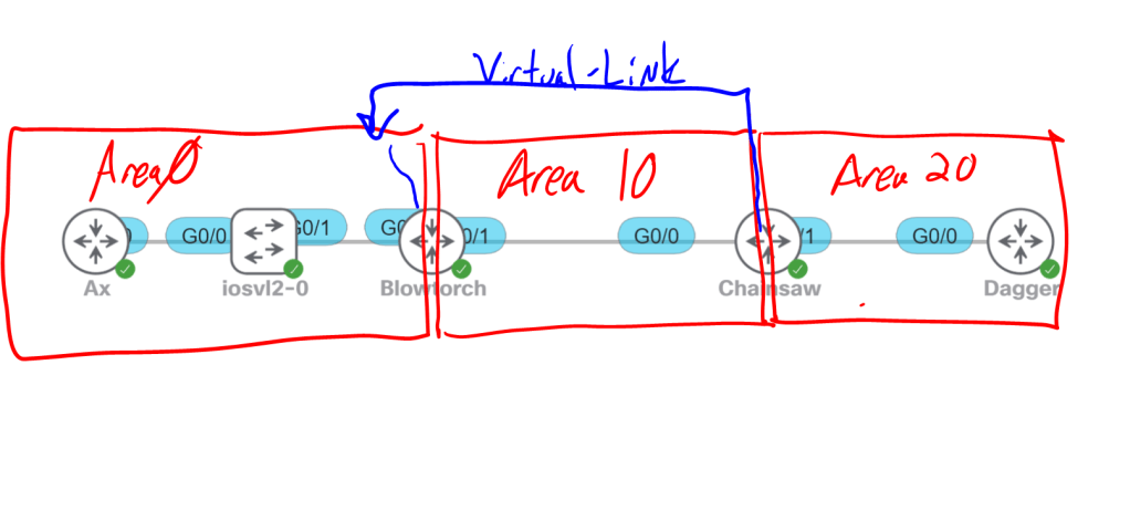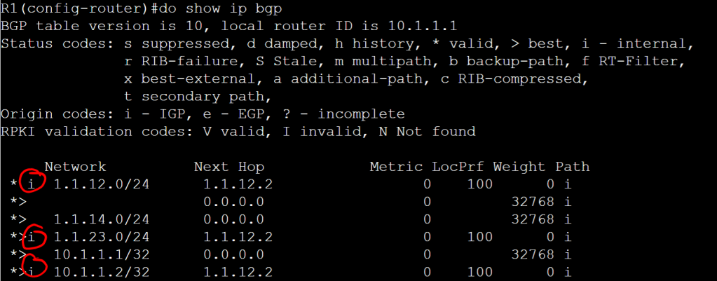 One more thing I don’t want to forget, OSPF has two types of routes, regular network routes that you can view with show ip route ospf, but there’s also an ABR/ASBR routing table. This one tells you how to get to the router-id of an ABR, ASBR, or ABR/ASBR. To view this table it’s show ip ospf border-routers. This table also tells us whether it’s inter-area or intra-area, and it shows the next hop and the interface to use.
